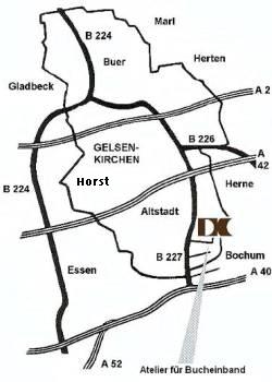 am Südrand der Stadt Gelsenkirchen an der B 227 Autobahn A2, Ausfahrt Nr. 6 -GELSENKIRCHEN-BUER- Richtung Gelsenkirchen-Zentrum zur A40 Autobahn A42, Ausfahrt Nr. 16 -GELSENKIRCHEN-ZENTRUM- A40, Ausfahrt Nr. 28 -GELSENKIRCHEN-SÜD- (folgen Sie bitte den Hinweisschildern "Künstlersiedlung Halfmannshof") oder ab HBf mit dem Bus 389 Richtung Bochum-Höntrop bis Haltestelle Halfmannsweg |